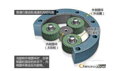 行星減速機(jī)顧名思義和我們熟悉的太陽(yáng)系行星相關(guān),他里面的結(jié)構(gòu)是由一個(gè)主動(dòng)輪帶動(dòng)三個(gè)從動(dòng)輪圍繞著內(nèi)齒圈也轉(zhuǎn)動(dòng),主動(dòng)輪專業(yè)名稱叫太陽(yáng)輪,從動(dòng)輪叫行星輪,也就是3個(gè)行星輪圍繞著太陽(yáng)輪,在內(nèi)齒圈軌道上運(yùn)轉(zhuǎn),猶如地球圍繞太陽(yáng)在一個(gè)不變的軌道上轉(zhuǎn),行星減速機(jī)叫法由此而來,行星減速器結(jié)構(gòu)圖如下圖所示: