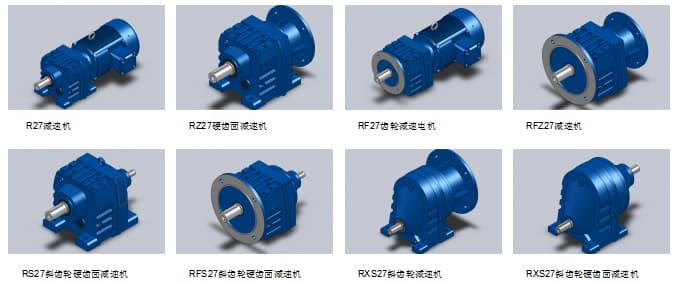 R27減速器產品概述 1、R27減速機結合國際德國技術要求制造,具有很高的科技含量; 2、硬齒面減速機有節省空間,高壽命,承受過載能力強,更大功率可達160KW; 3、低能耗,性能優,效率高達96%以上; 4、R系列斜齒輪硬齒面減速機選用優質鋼材料,球磨鑄鐵箱體,齒輪表面經過滲碳處理。 5、可靈活性的配對各種電機,如伺服電機,三相異步電機,直流電機等