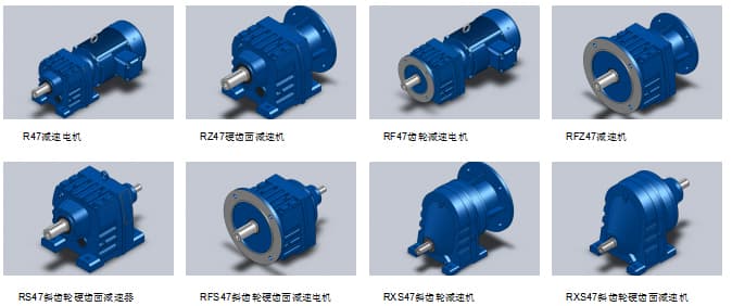 R47減速器概述 1、R47減速機結合國際德國技術要求制造,具有很高的科技含量; 2、斜齒輪硬齒面減速機有節省空間,高壽命,承受過載能力強,更大功率可達160KW; 3、低能耗,性能優,效率高達96%以上; 4、R系列斜齒輪硬齒面減速機選用優質鋼材料,球磨鑄鐵箱體,齒輪表面經過滲碳處理。 5、可靈活性的配對各種電機,如伺服電機,三相異步電機,直流電機等。